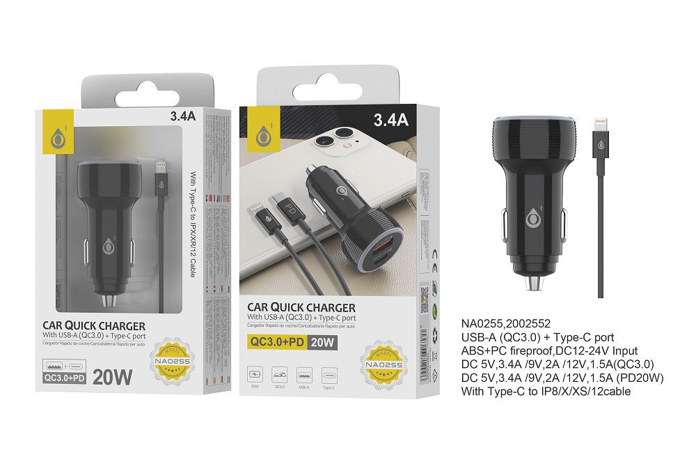 NA0255 NE Cargador Rapido de Coche Bledsoe con Cable PD de Type C a IP, con 1 USB (QC3.0)+1puerta de PD, 3.4A MAX, 20W, Negro