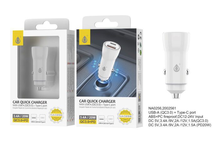 NA0256 BL Cargador Rapido de Coche Dallis sin cable, con 1 USB (QC3.0) + 1 puerta de PD, 3.4A(Max), 20W, Blanco