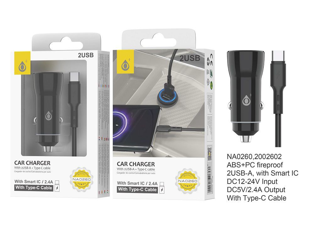 NA0260 NE Cargador de Coche Biron con Cable Type-C, Chip de Reconocimiento Inteligente, con 2 USB, 2.4A, Negro