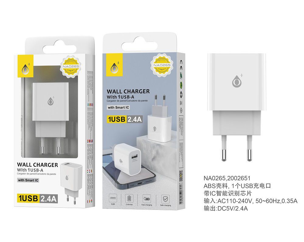 NA0265 BL Cargador de Pared Lora sin Cable, con Chip de Reconocimiento Inteligente,  1 USB, 5V, 2.4A