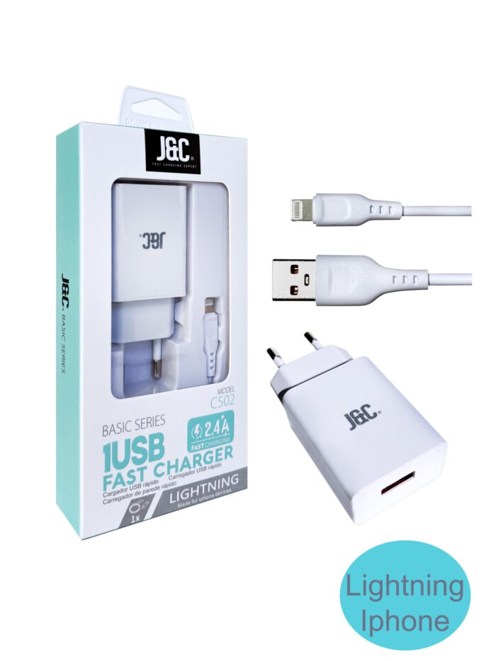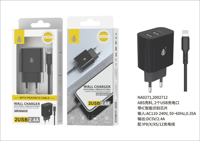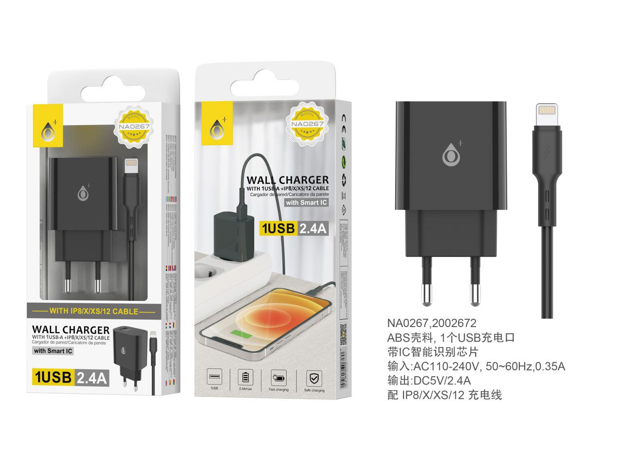 NA0267 NE Cargador de Pared Lora con Cable Ip 5-12, con Chip de Reconocimiento Inteligente, 1 USB, 5V, 2.4A, Negro