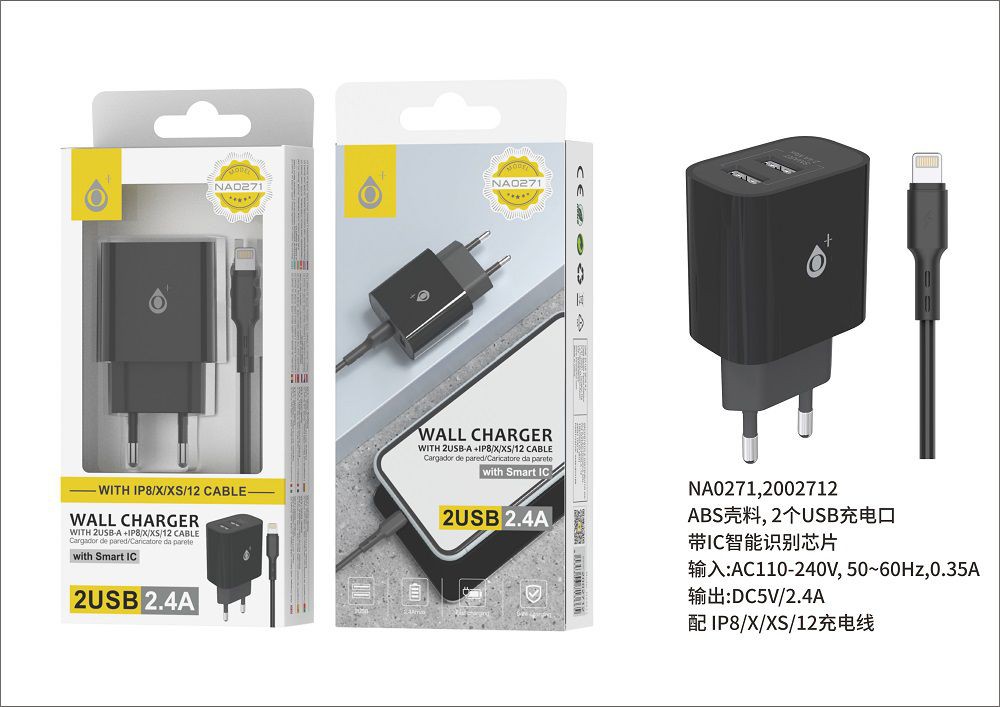 NA0271 NE Cargador de Pared Lora con Cable IP 5-13, con Chip de Reconocimiento Inteligente,  2 USB,