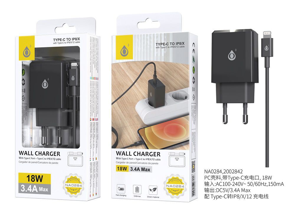 NA0284 NE Cargador Rapido de Pared Eliza , PD 18W, con cable C to Lightning, Negro
