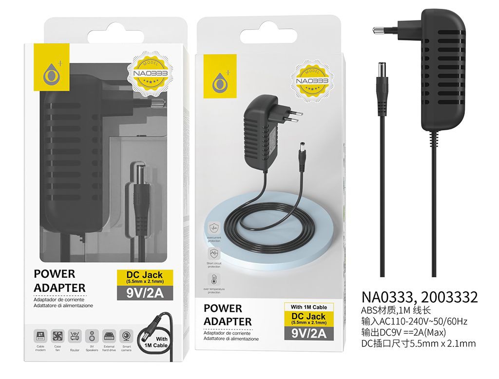NA0333 NE Cargador Universal  con Conector Jack DC 9V/2A ( 5.5mm X 2,1mm) 1M, Negro