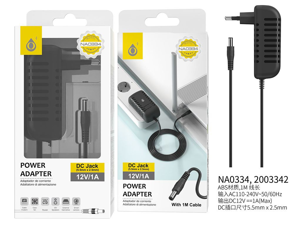NA0334 NE Cargador Universal  con Conector Jack DC 12V/1A ( 5.5mm X 2,5mm) 1M, Negro