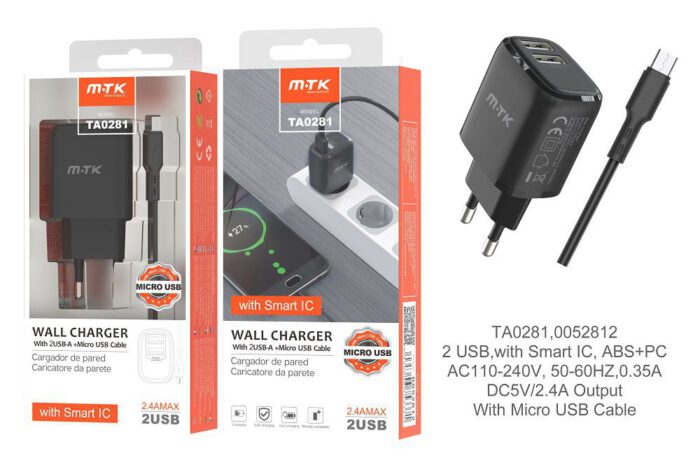 NA0391 NE Cargador de Red KAI 2 USB Con Smart Chip, Con Cable Micro USB, 2.4A, Negro
