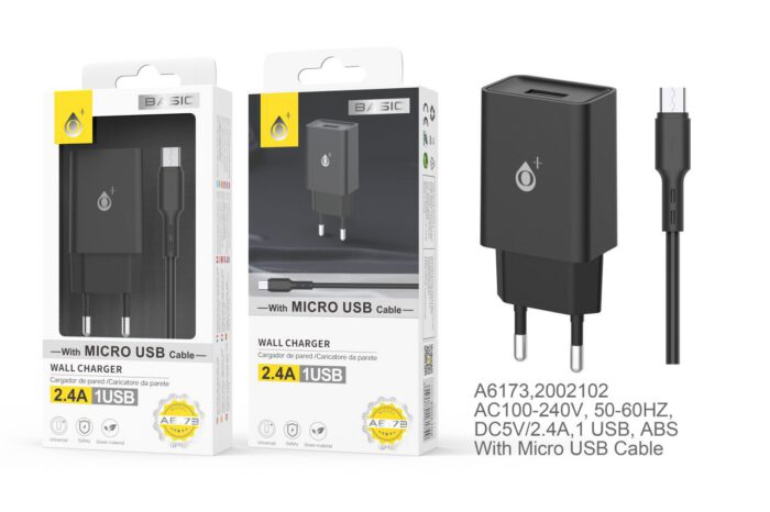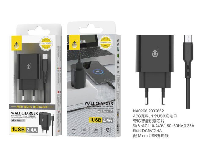 • NA0387 NE Cargador de Red KAI 1 USB Con Smart Chip, Con Cable Micro USB , 2.4A, Negro