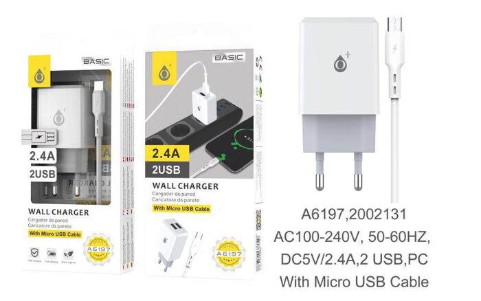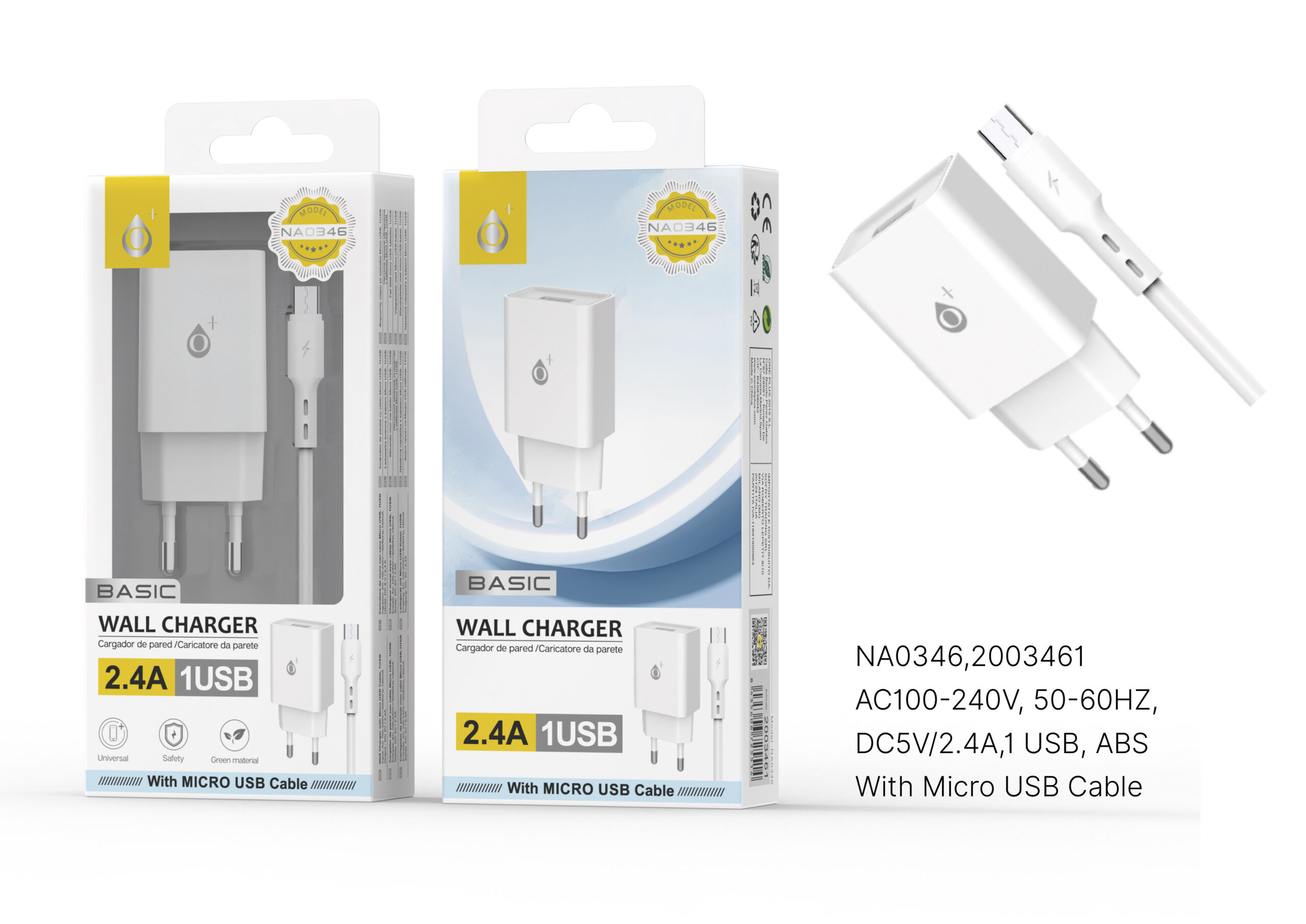 NA0346 BL Cargador de Red  S. Basic Clover 1 USB Con cable Micro USB, 2.4A, Blanco