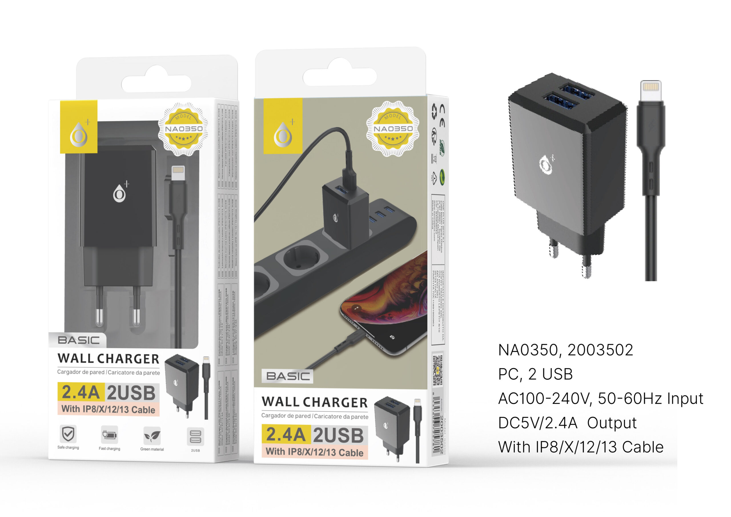NA0350 NE Cargador de Red S.Basic JODY 2 USB Con cable Iphone 5-13 , 2.4A, Negro