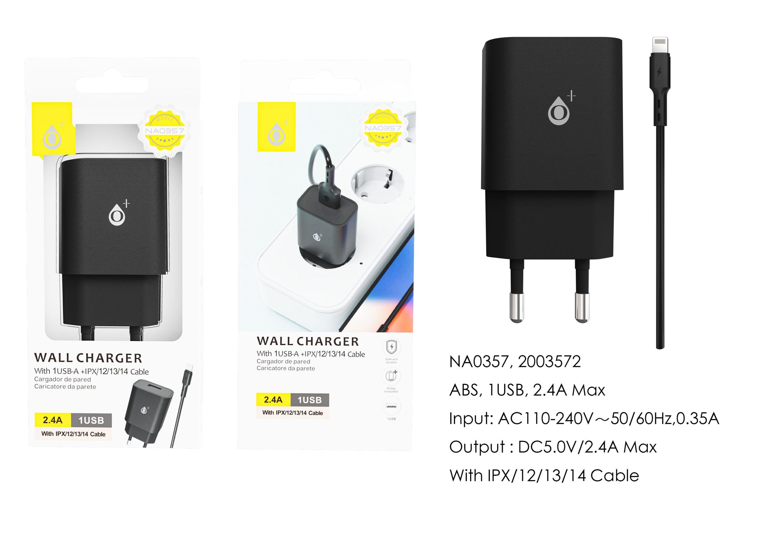 NA0357 NE Cargador de Red Doll 1 USB con cable Iphone 5-14 , 5V/2.4A, Negro