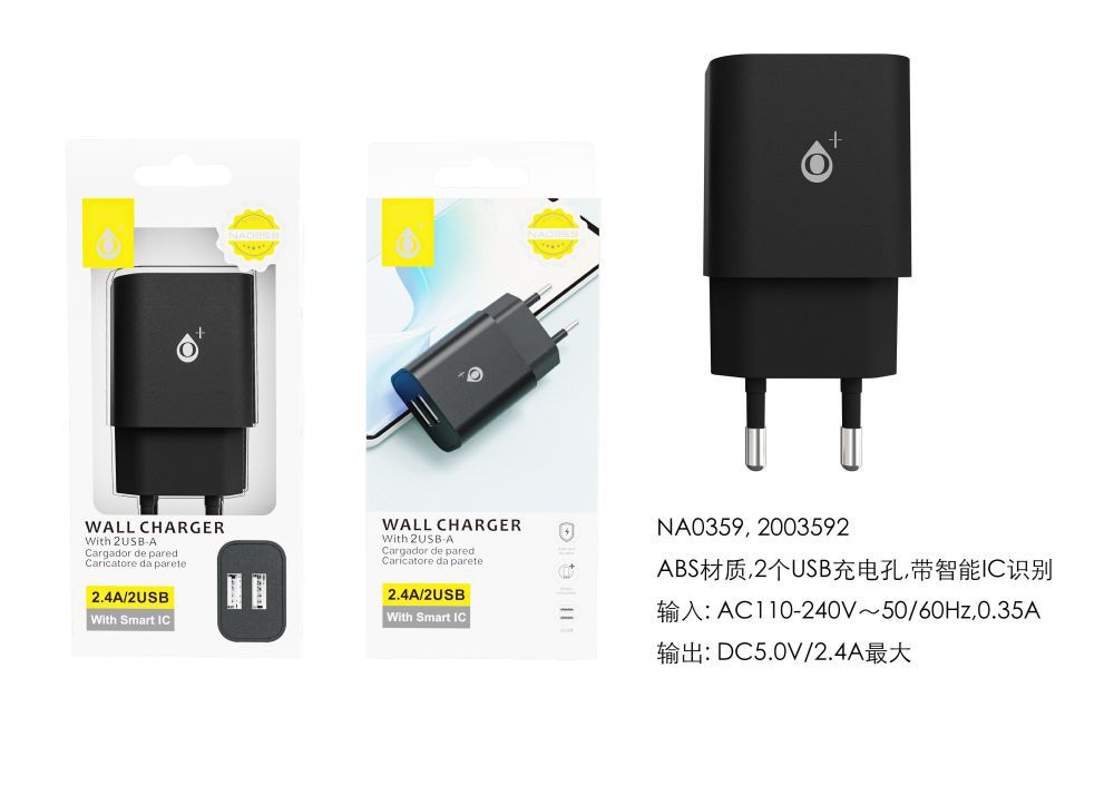 NA0359 NE Cargador de Red ELIO Con Chip de Reconocimiento Inteligente, 2 USB sin cable, 5V/2.4A Max, Negro