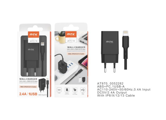 • TA0408 NE Luxury Cargador de Red Ayme, 1 puerto USB-A, Con Cable Iphone 5-14, 2.4A(Max), Negro