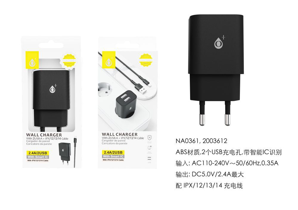 NA0361 NE Cargador de Red ELIO  Con Chip de Reconocimiento Inteligente, 2 USB Con cable Iphone 5-14 , 5V/2.4A Max, Negro