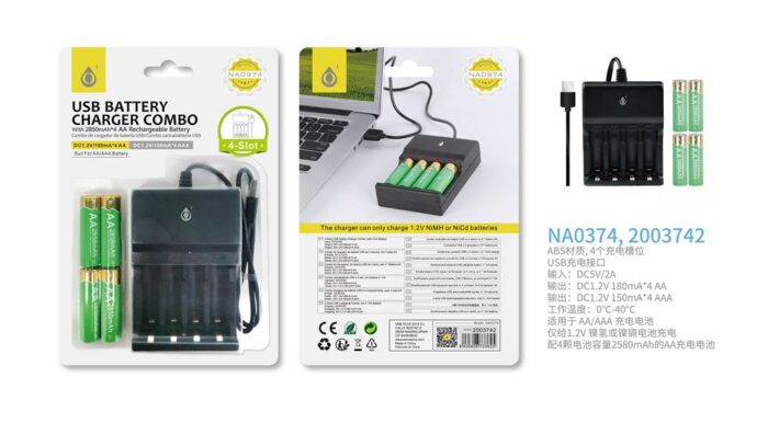 NA0374 Cargador USB de Pilas Ni-MH o NiCd (AA/AAA 1.2V), Incluye 4 Pilas Recargable AA 2850mAh Ni-MH , Negro