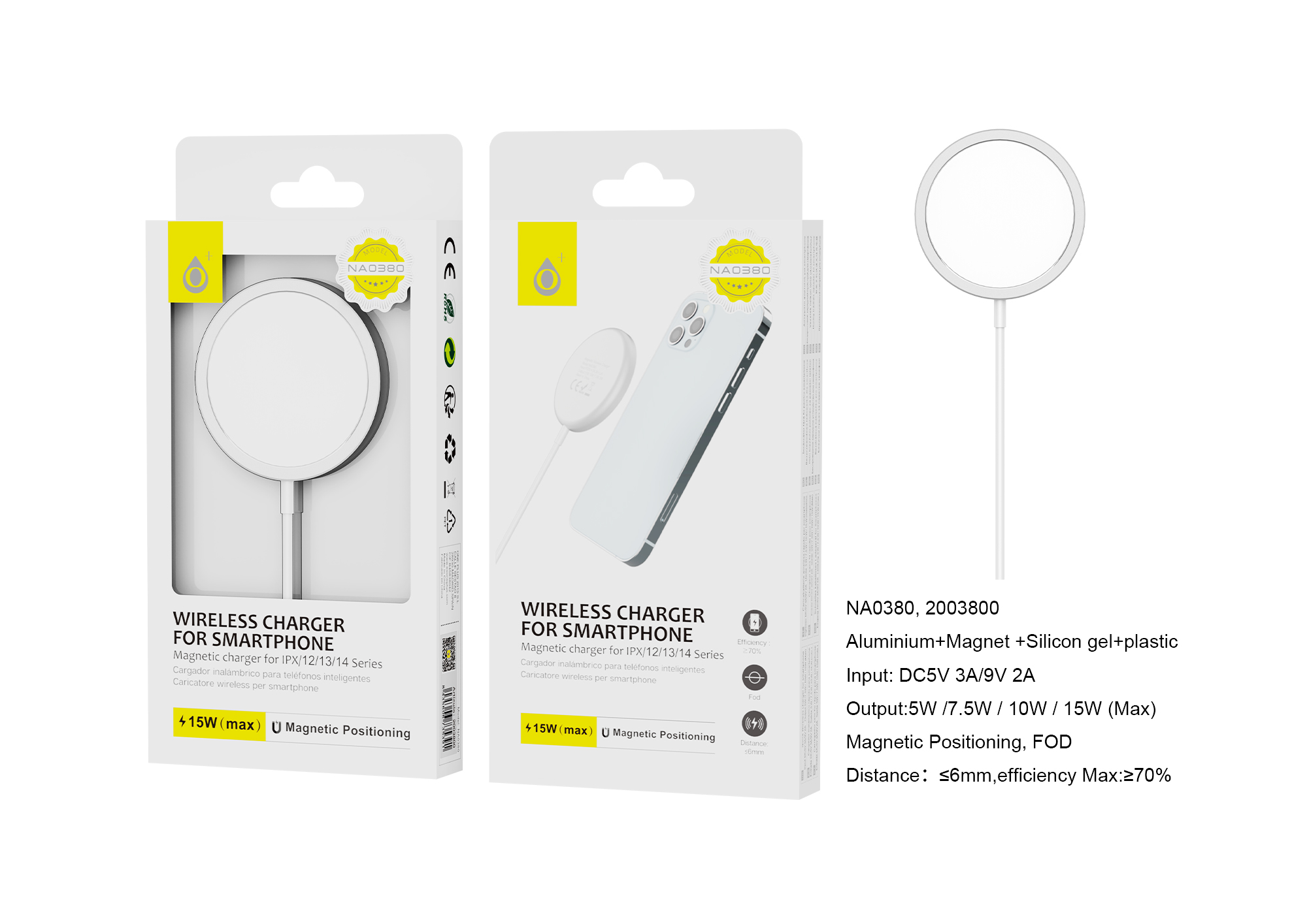 NA0380 BL Cargador Magnetico Inalambrico para moviles Iphone X-14, 15W(Max) , Blanco