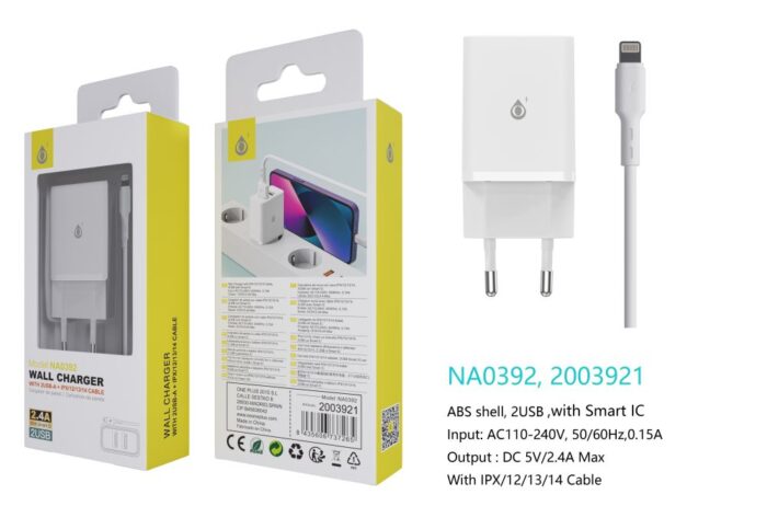 • NA0392 NE Cargador de Red KAI 2 USB Con Smart Chip, Con Cable Iphone 5-14, 2.4A, Negro