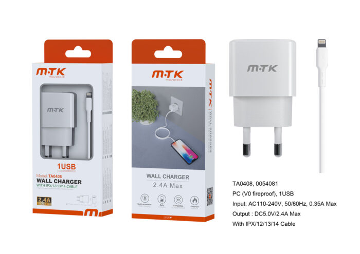 • TA0408 BL Luxury Cargador de Red Ayme, 1 puerto USB-A, Con Cable Iphone 5-14, 2.4A(Max), Blanco