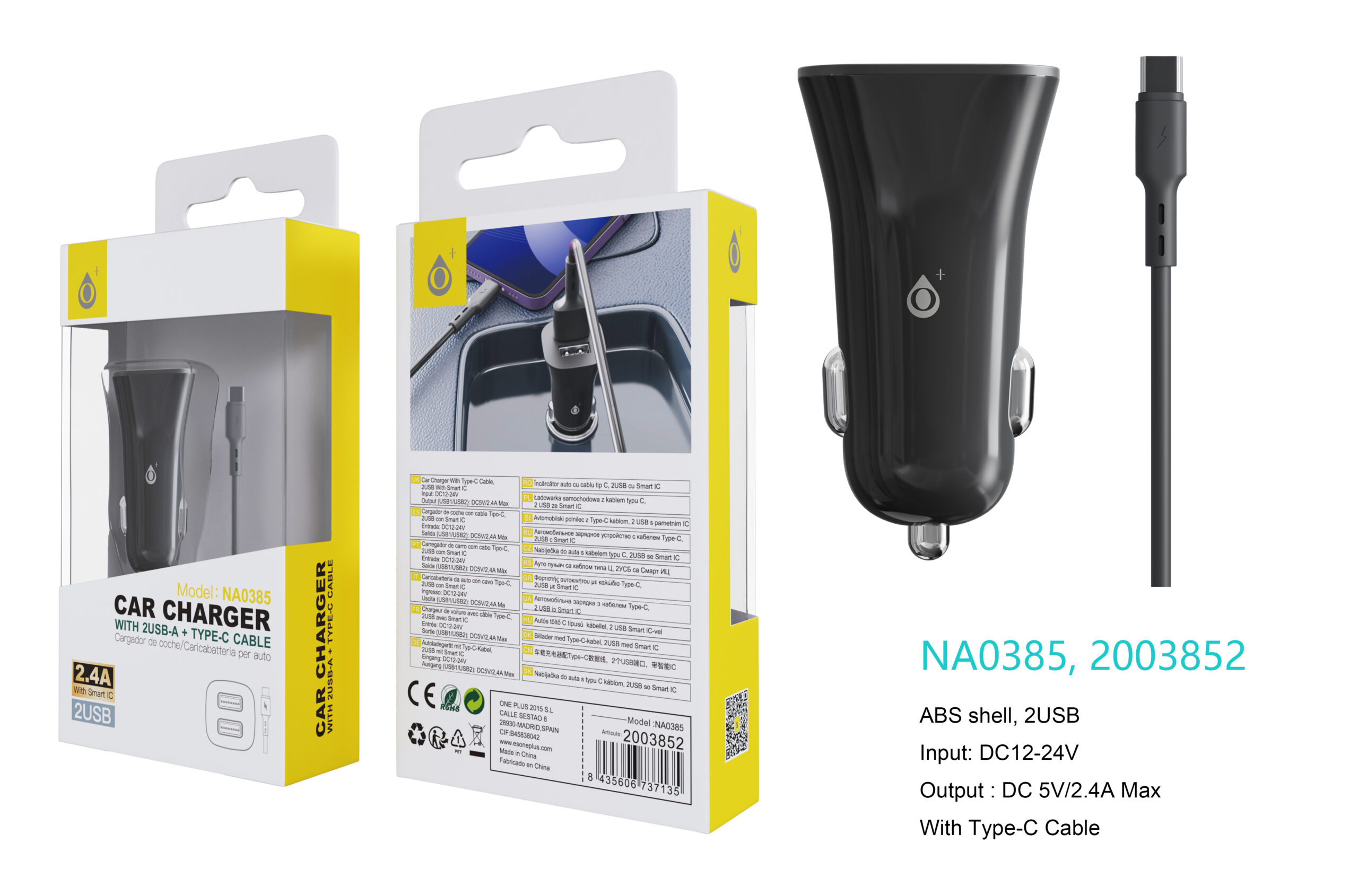 NA0385 NE Cargador de Mechero Carole Con Smart Chip, 2USB, Con cable Type-C, 2.4A, Negro