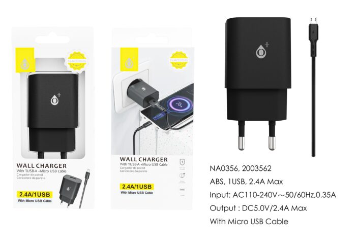 • NA0356 NE Cargador de Red Doll 1 USB con cable Micro USB , 5V/2.4A, Negro