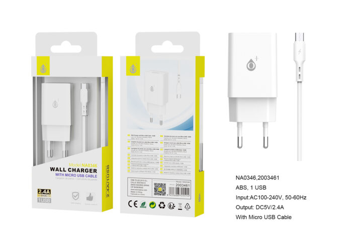 NA0387 BL Cargador de Red KAI 1 USB Con Smart Chip, Con Cable Micro USB , 2.4A, Blanco