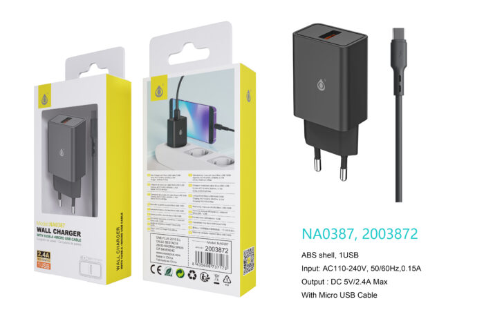 NA0387 NE Cargador de Red KAI 1 USB Con Smart Chip, Con Cable Micro USB , 2.4A, Negro