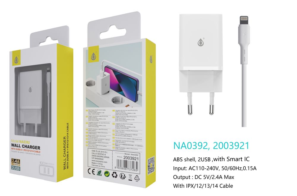 NA0392 BL Cargador de Red KAI 2 USB Con Smart Chip, Con Cable Iphone 5-14, 2.4A, Blanco