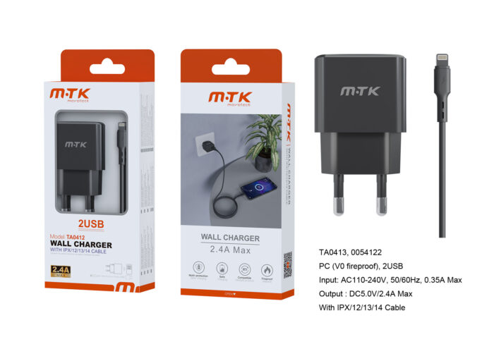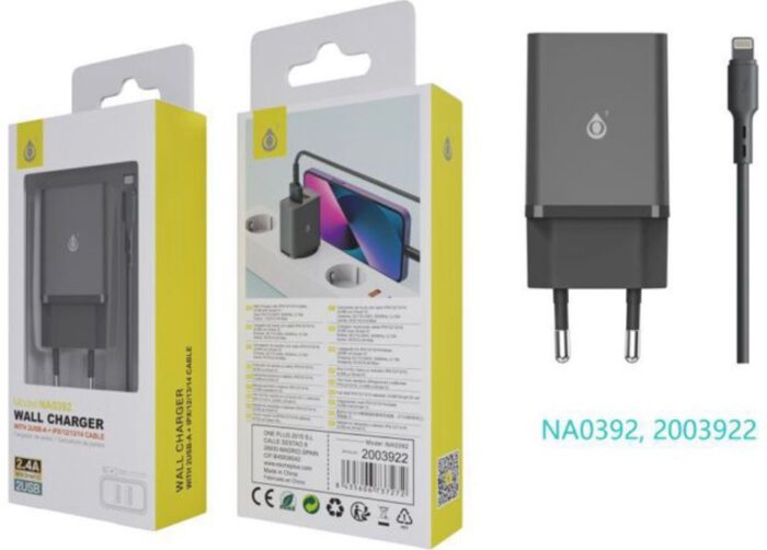 NA0392 NE Cargador de Red KAI 2 USB Con Smart Chip, Con Cable Iphone 5-14, 2.4A, Negro