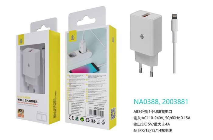 • NA0357 NE Cargador de Red Doll 1 USB con cable Iphone 5-14 , 5V/2.4A, Negro
