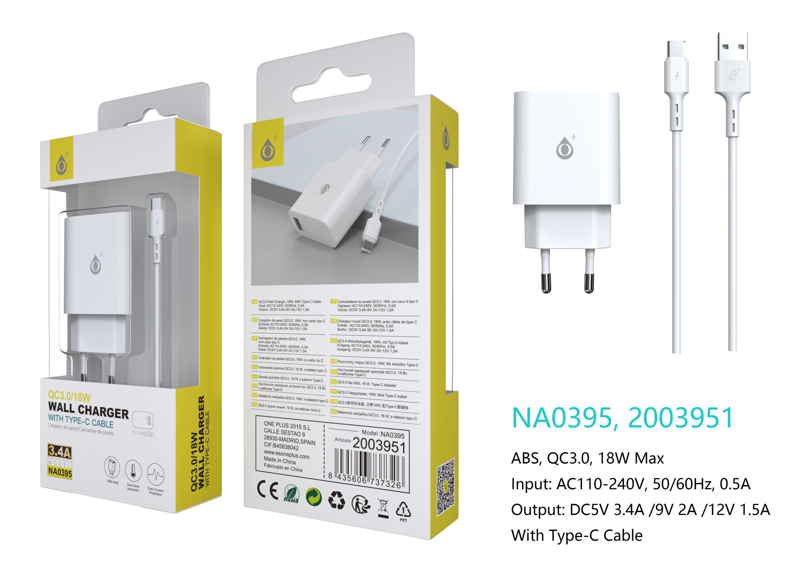 NA0395 BL Cargador Rapido de Pared Berta, 1 puerto USB-A QC 3.0, Con Cable Type-C, 18W/3.4A(Max) , Blanco