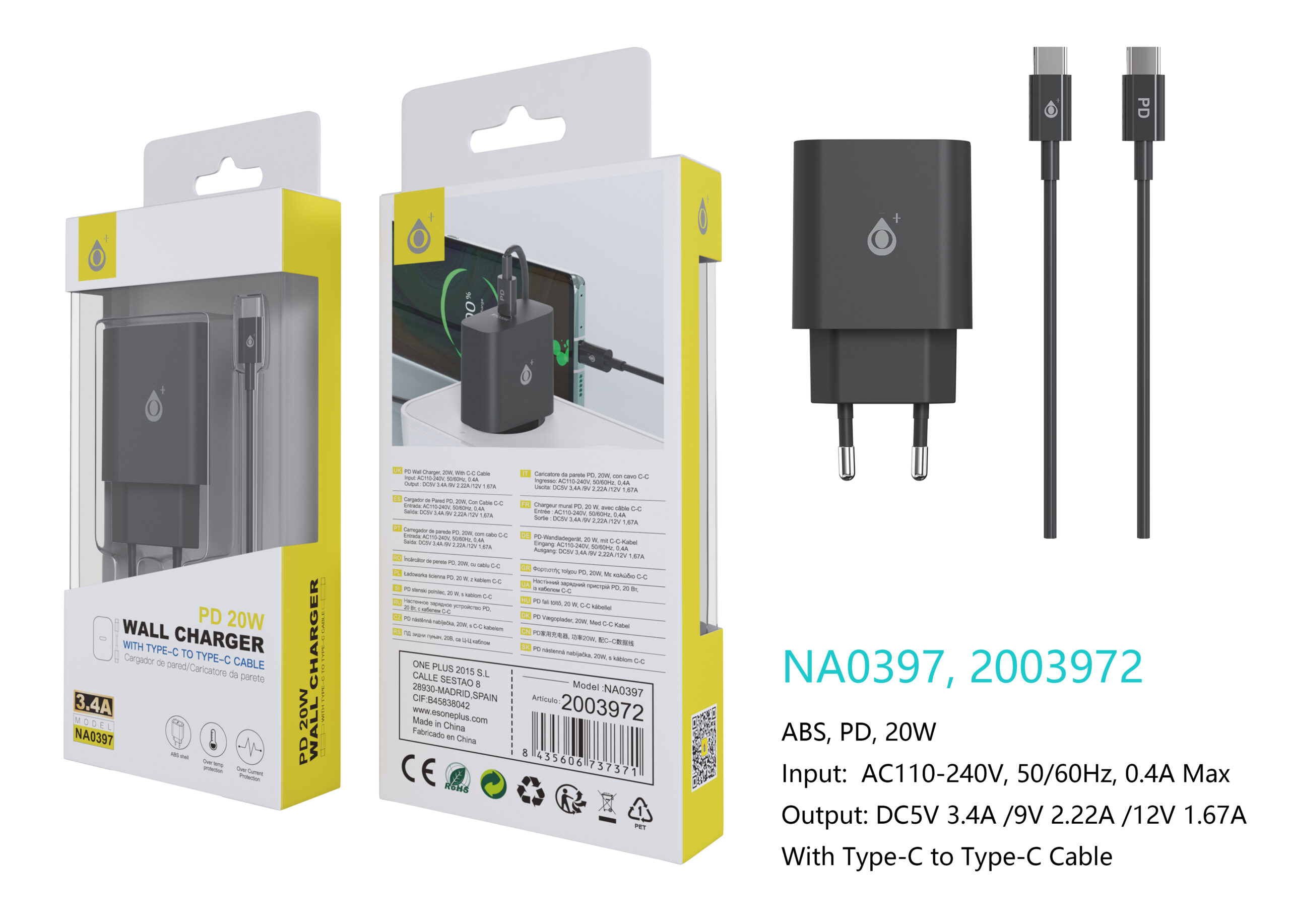NA0397 NE Cargador de Red Rapida Berta , 1 puerto USB-CC PD, con Cable Type-C a Type-C, 20W/3.4A(Max), Negro