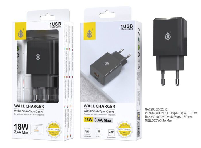 • NA0275 NE Cargador Pared Zafi, sin Cable, con 1 puerta USB + 1 puerta PD, 18W, 3.4A Max, Negro