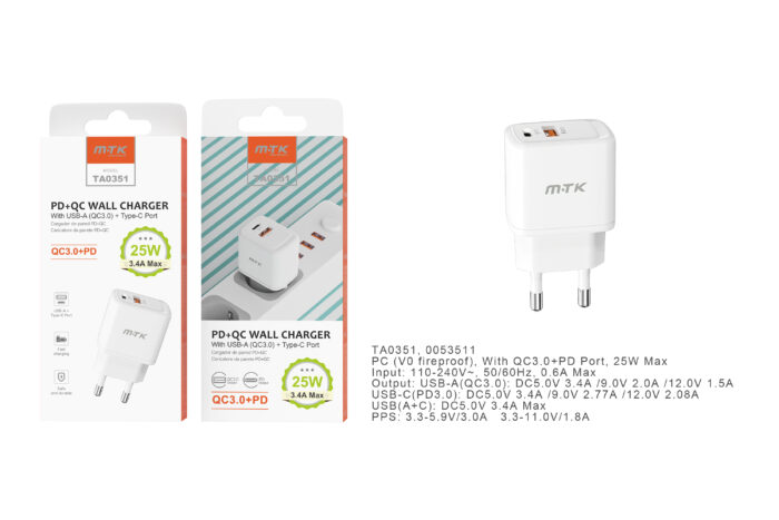 • TA0332 BL Cargador de Red Rapida Fay , 2 puertos (PD+QC 3.0), Sin Cable , 25W/3.4A(Max), Blanco