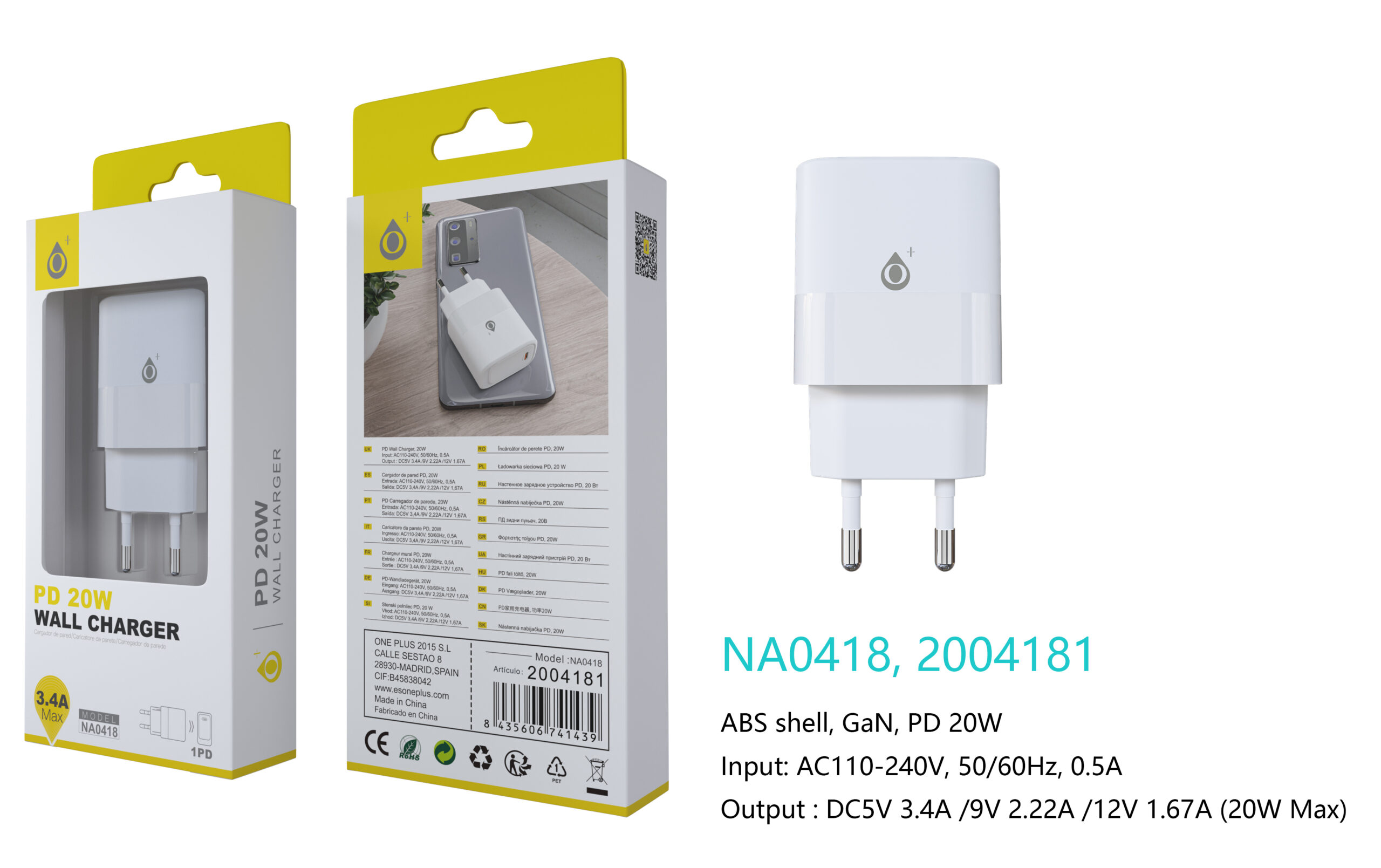 NA0418 BL Cargador GaN de Red Rapida Fort, 1 puerto USB-C PD,  Sin Cable, 20W/3.4A(Max), Blanco