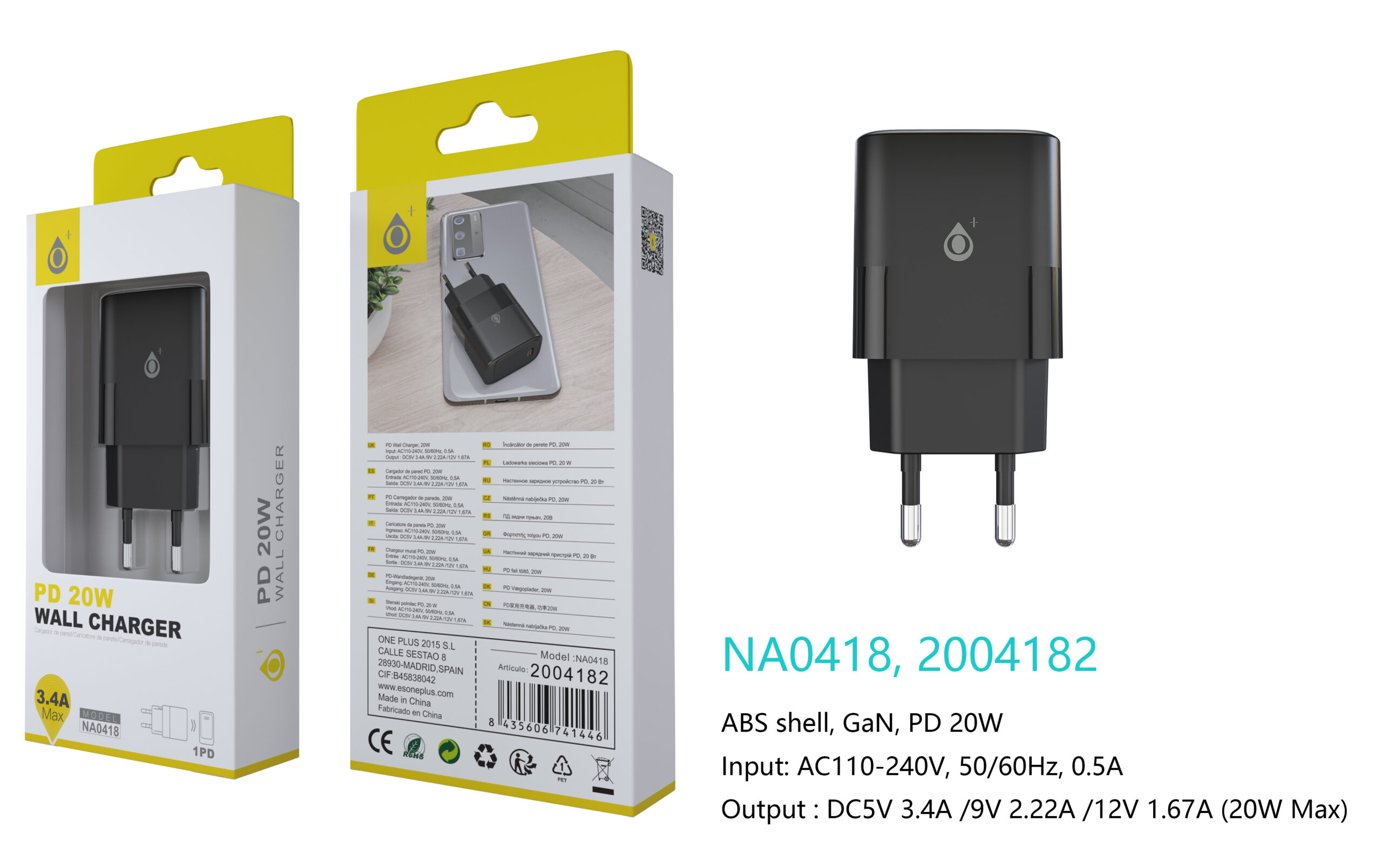 NA0418 NE Cargador GaN de Red Rapida Fort, 1 puerto USB-C PD, Sin Cable, 20W/3.4A(Max), Negro