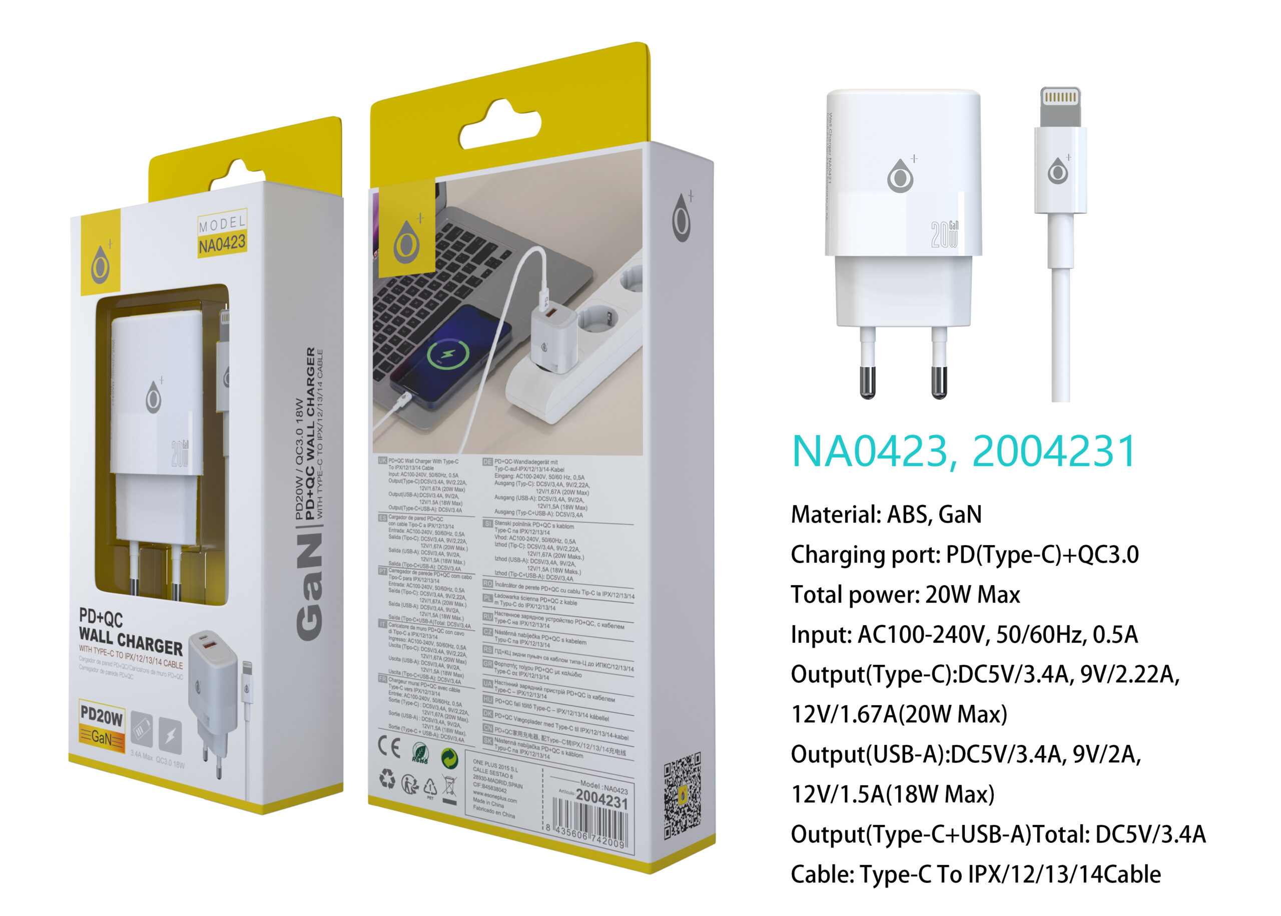 NA0423 BL Cargador GaN de Red Rapida Fort, 2 puerto USB-C(20W)+USB-A QC3.0(18W), Con Cable Type-C a Lightning, Blanco