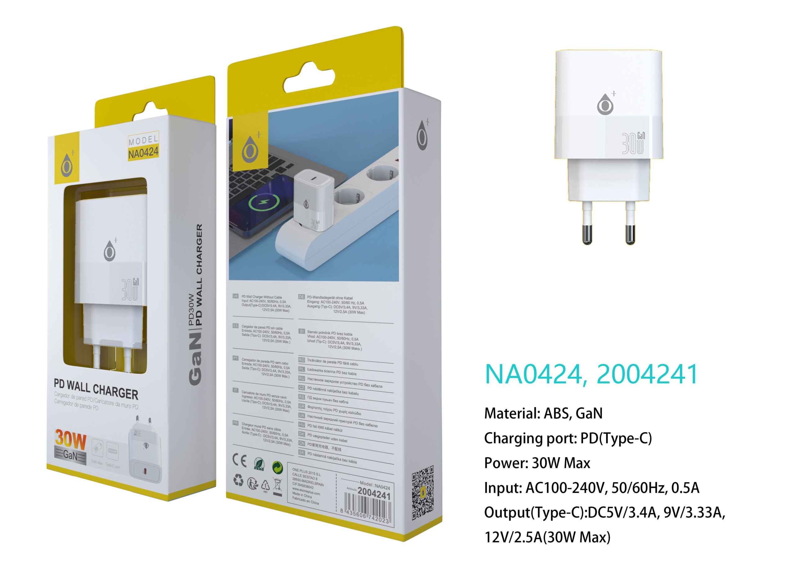 NA0424 BL Cargador GaN de Red Rapida Fort, 1 puerto USB-C PD,  Sin Cable, 30W/12V/2.5A(Max), Blanco