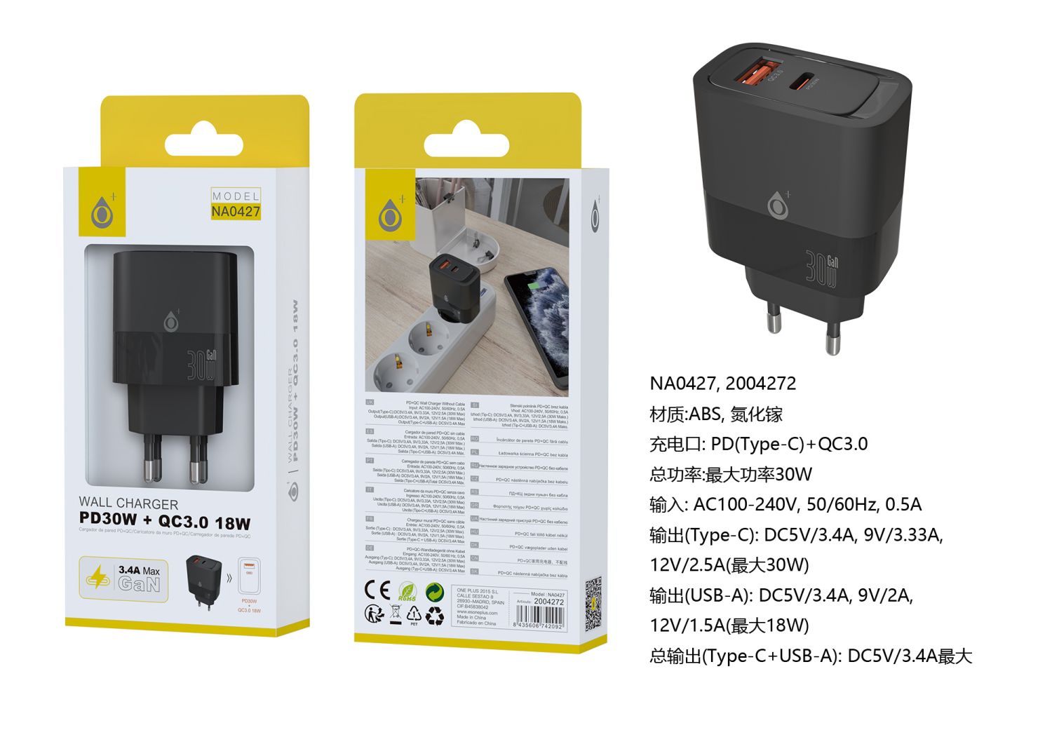 NA0427 NE Cargador GaN de Red Rapida Fort, 2 puerto USB-C(30W)+USB-A QC3.0(18W), Sin Cable, Negro