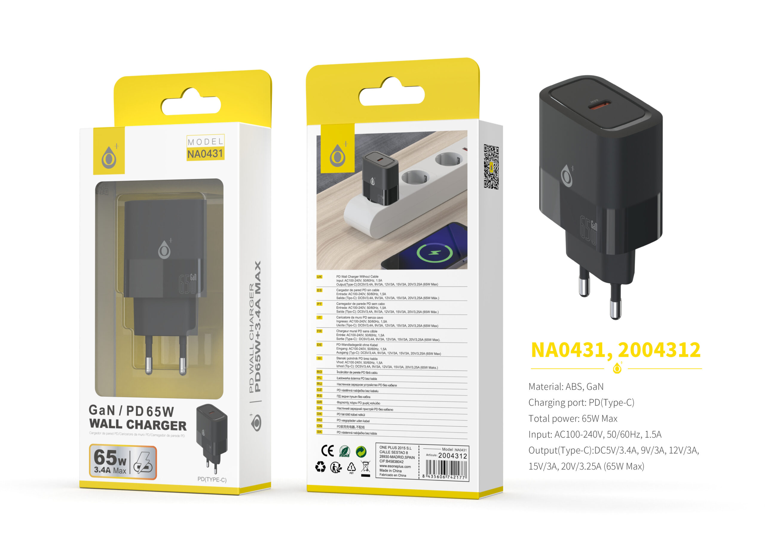 NA0431 NE Cargador GaN de Red Rapida Fort, 1*USB-C, Sin Cable, 65W/3.4A(Max), Negro