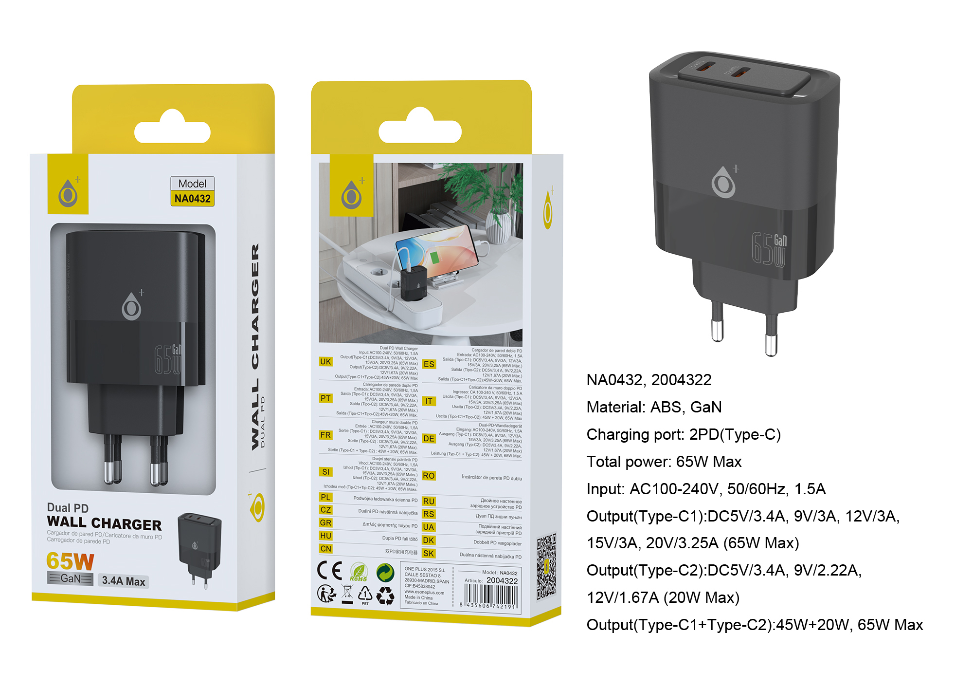 NA0432 NE Cargador GaN de Red Rapida Fort, 2*USB-C, Sin Cable, 65W/3.4A(Max), Negro