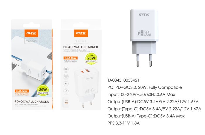 • TA0344 BL Cargador Rapido de Pared Marga Sin cable , Entrada Type-C(PD)/20W/3.4A Max , Blanco