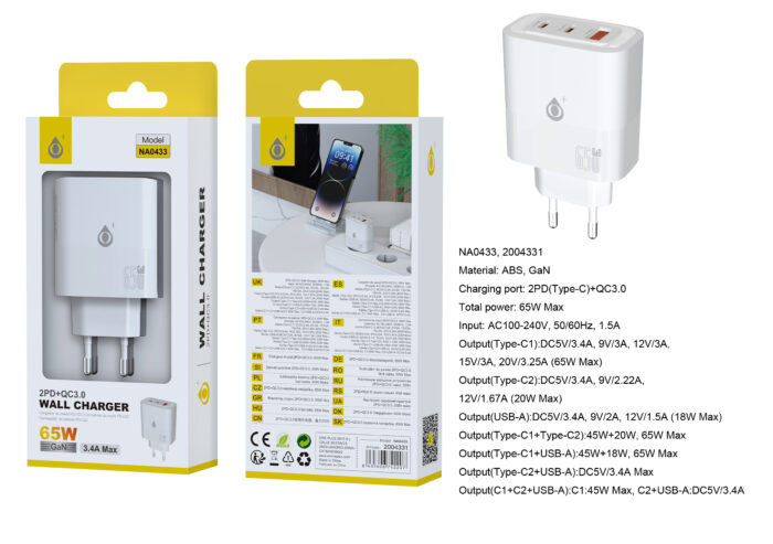 NA0433 BL Cargador GaN de Red Rapida Fort, 2*USB-C+1*USB-A QC 3.0 , Sin Cable, 65W/3.4A(Max), Blanco