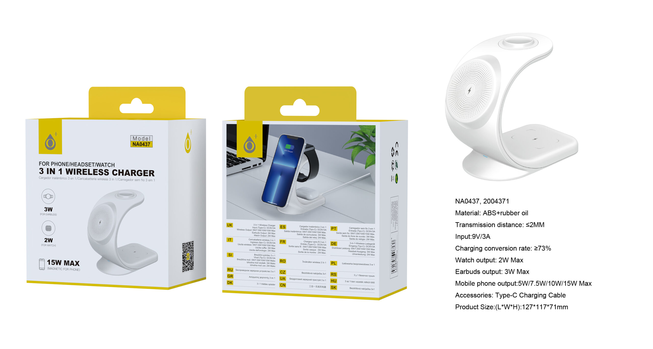 NA0437 BL Cargador Inalambrico 3 en 1(Movil 15W/AirPods 3W/Iwatch 2W), Con Cable Type-C 9V/3A, Blanco