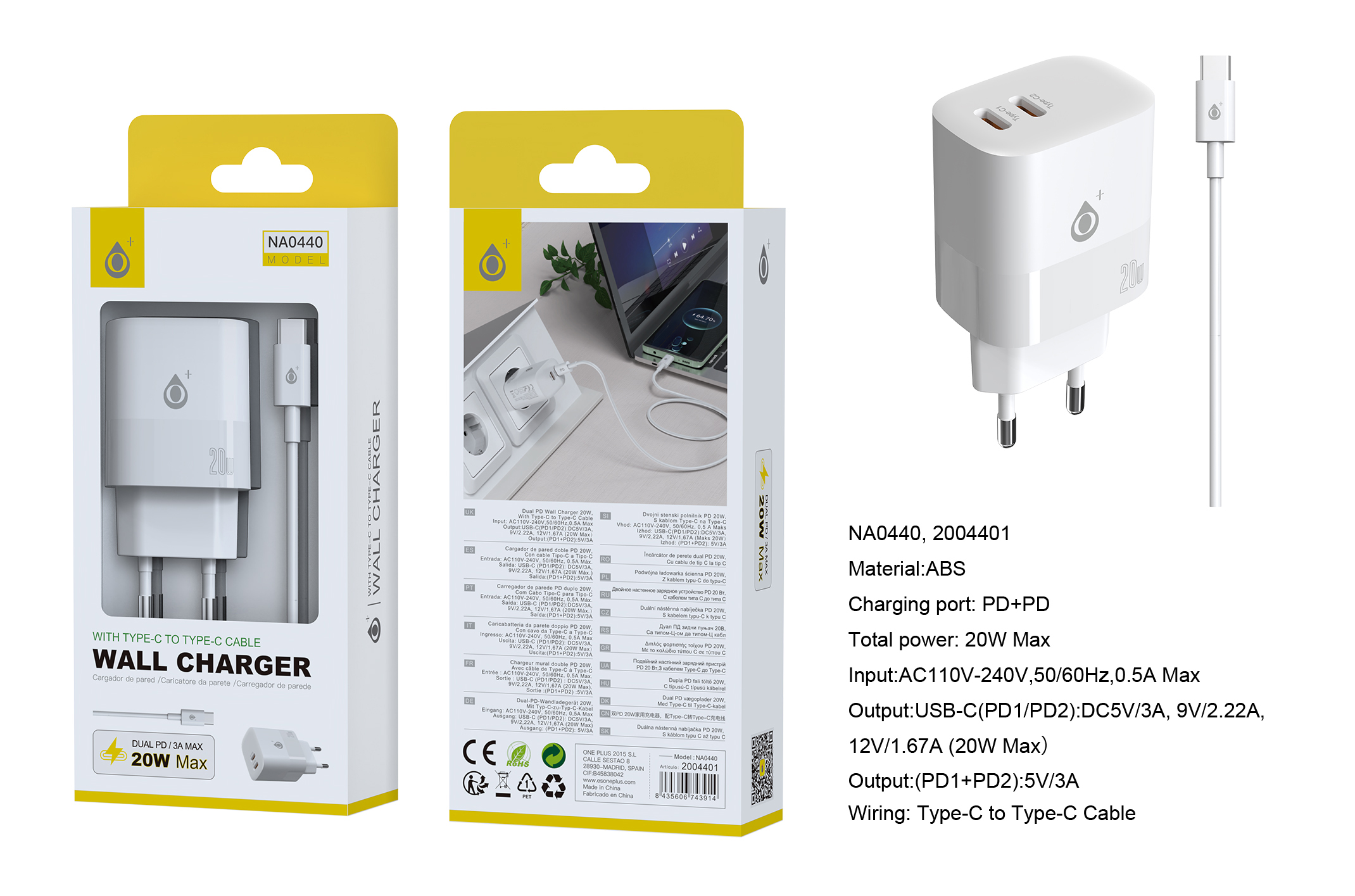 NA0440 BL Cargador de red rapida Fort, 2 puertos USB-C*2 (20W Max), Con cable Type-C, Blanco
