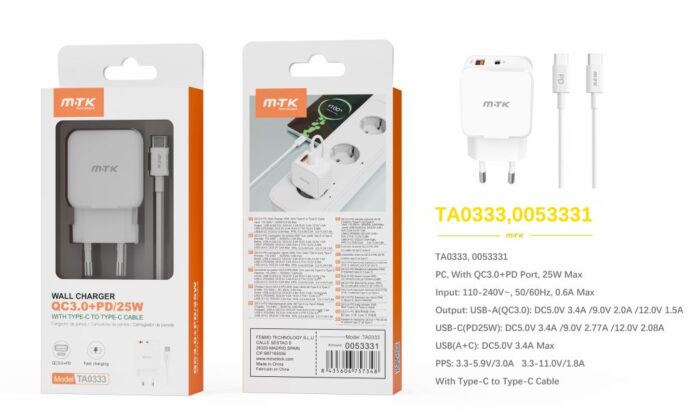 • TA0345 BL Cargador Rapido de Pared Marga Sin cable , Entrada Type-C(PD)+QC3.0)/20W/3.4A Max , Blanco