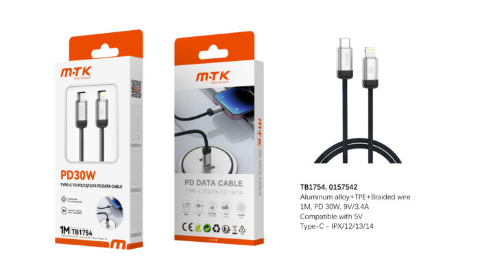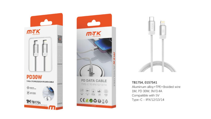 • TB1754 Luxury Cable de datos Dralvox trenzado para Type-C a Lightning, 30W/9V/3.4A, 1M, Blanco+Plata