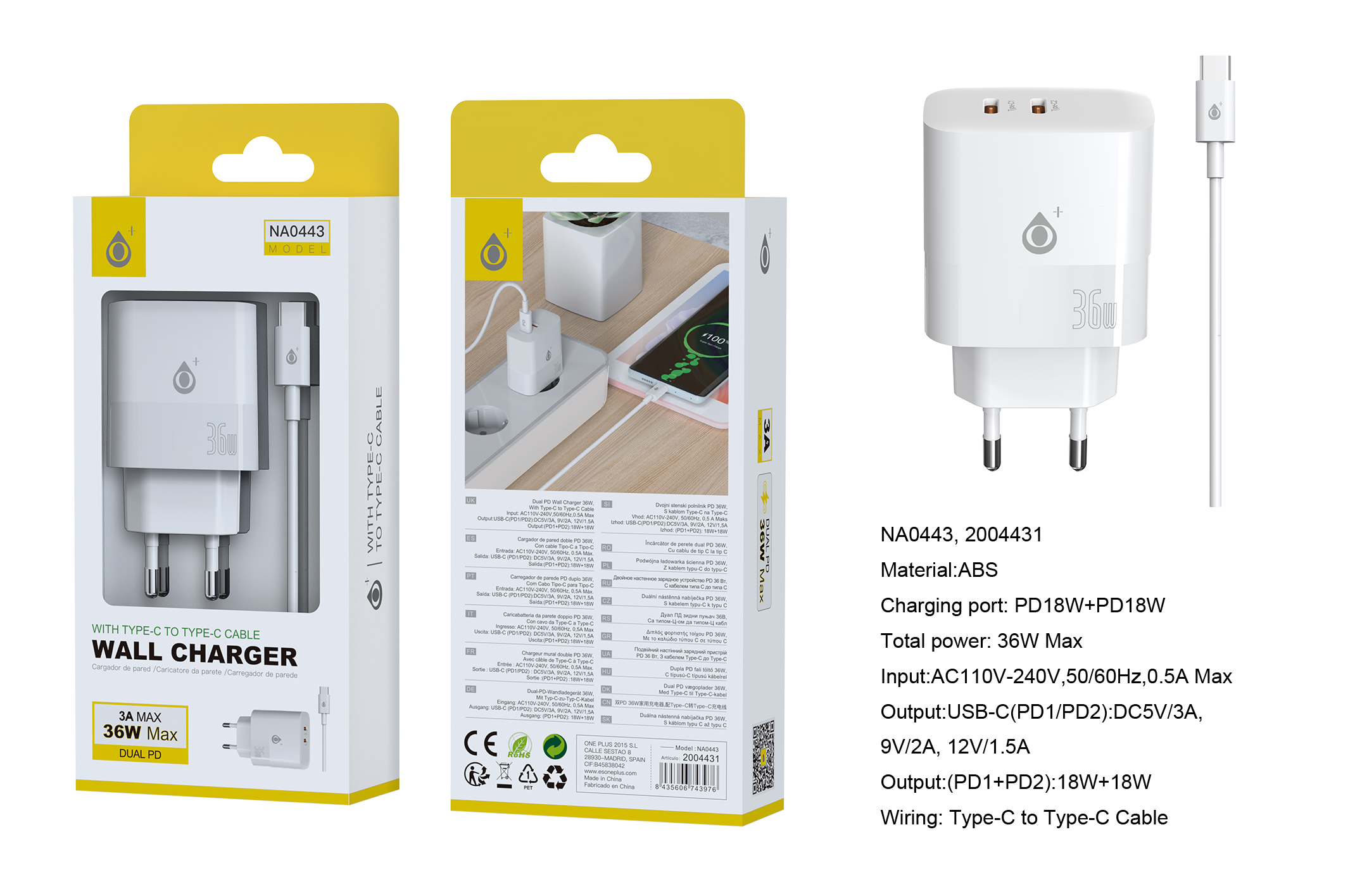NA0443 BL Cargador de red rapida Fort, 2 puertos USB-C*2 (36W Max), Con cable Type-C, Blanco