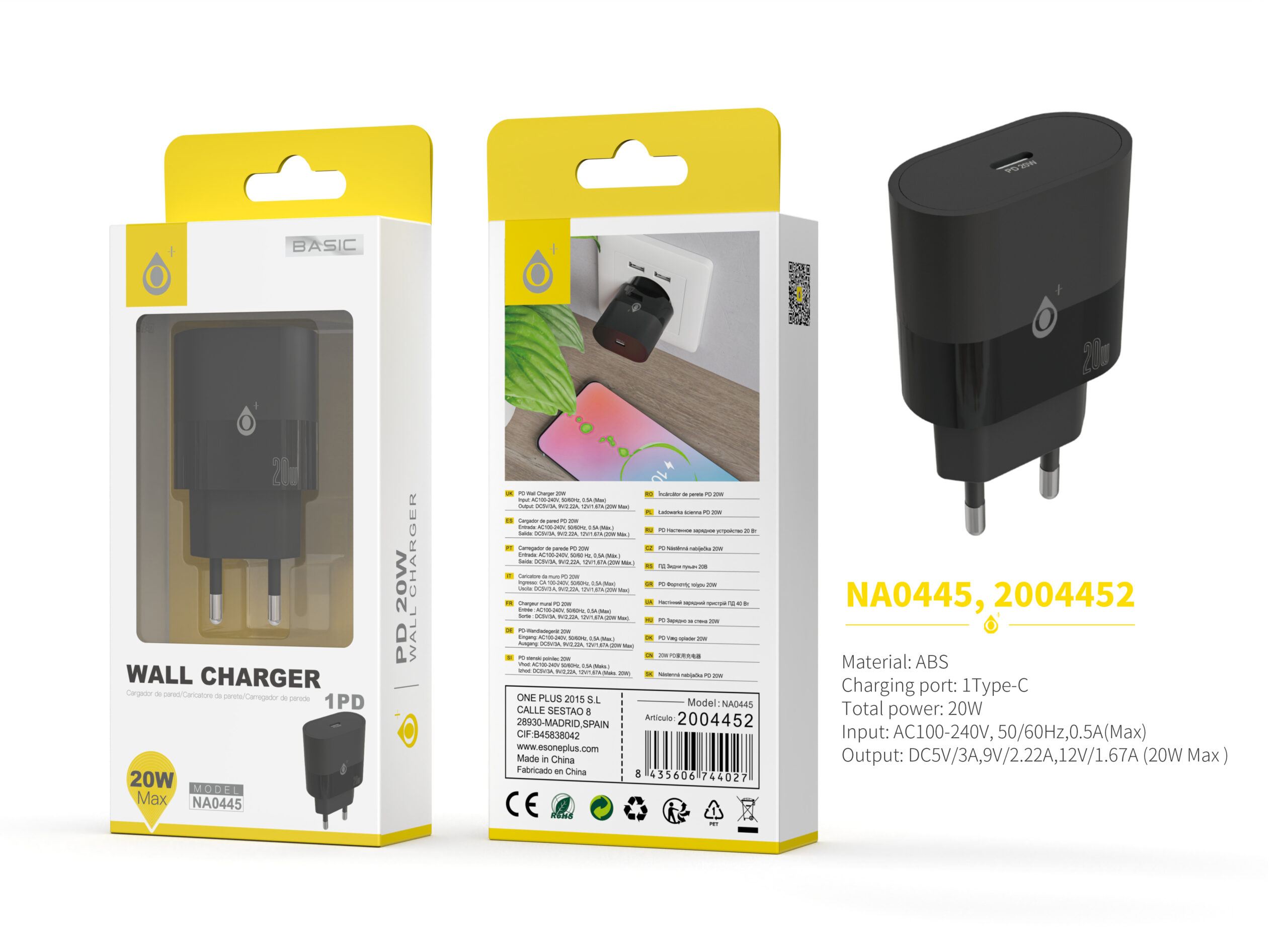 NA0445 NE Cargador de Red Rapida Jorwin, 1 Type-C PD, Sin cable, 20W Max, Negro