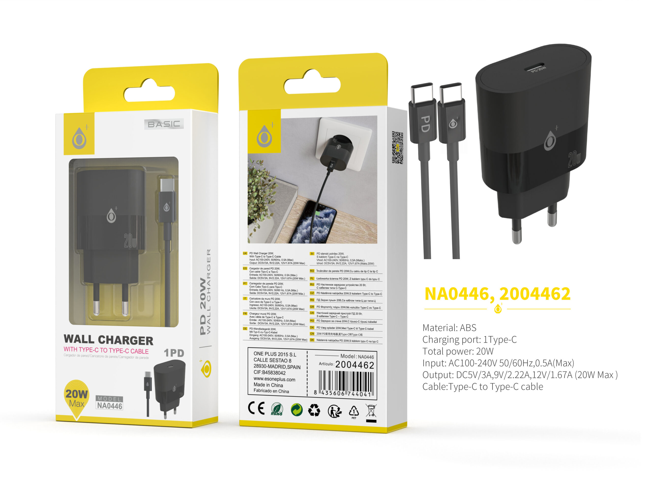NA0446 NE Cargador de Red Rapida Jorwin, 1 Type-C PD, Con cable Type-C a Type-C, 20W Max, Negro