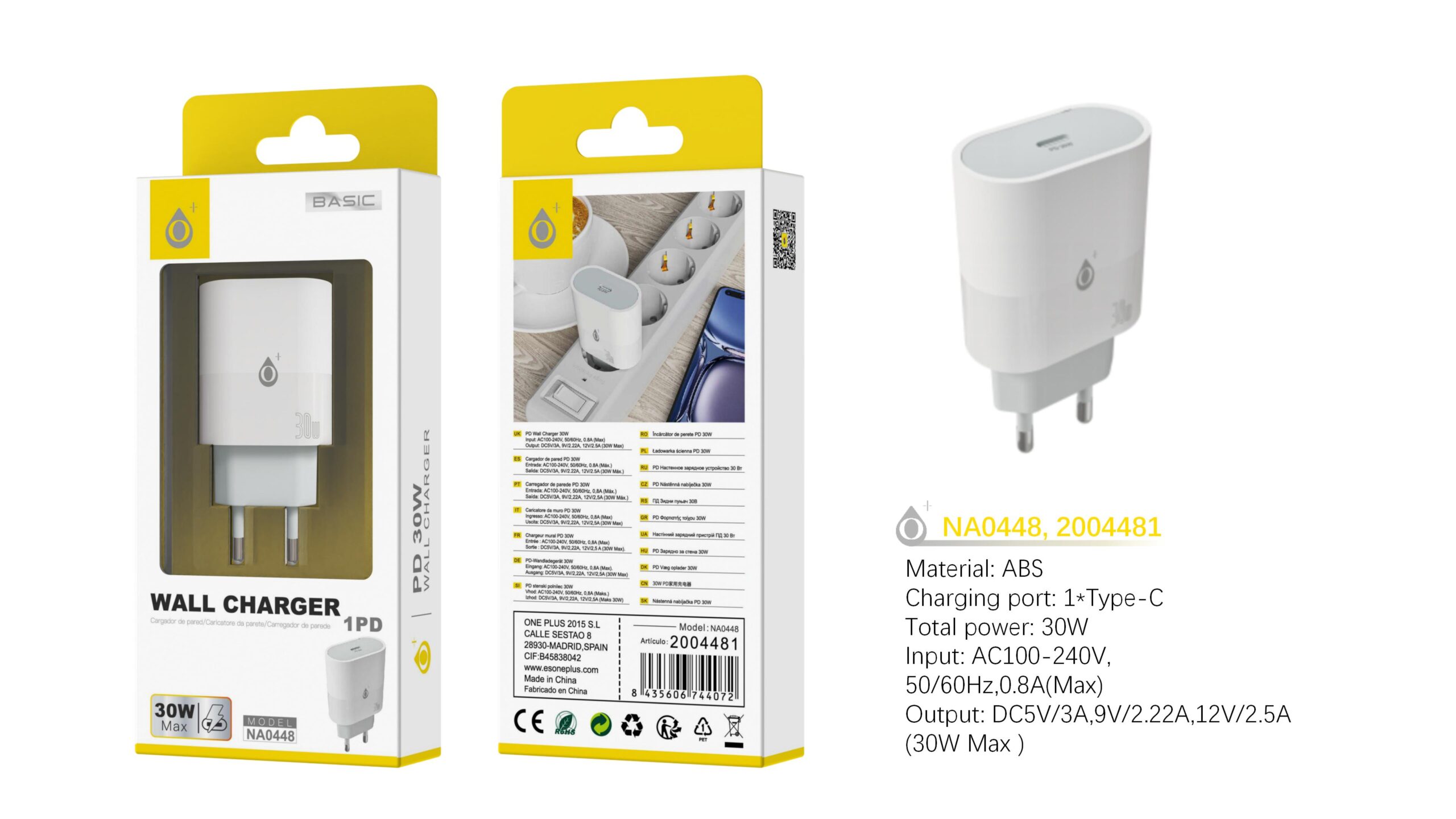 NA0448 BL Cargador de Red Rapida Jorwin 30W, 1 Type-C PD, Sin cable, Blanco