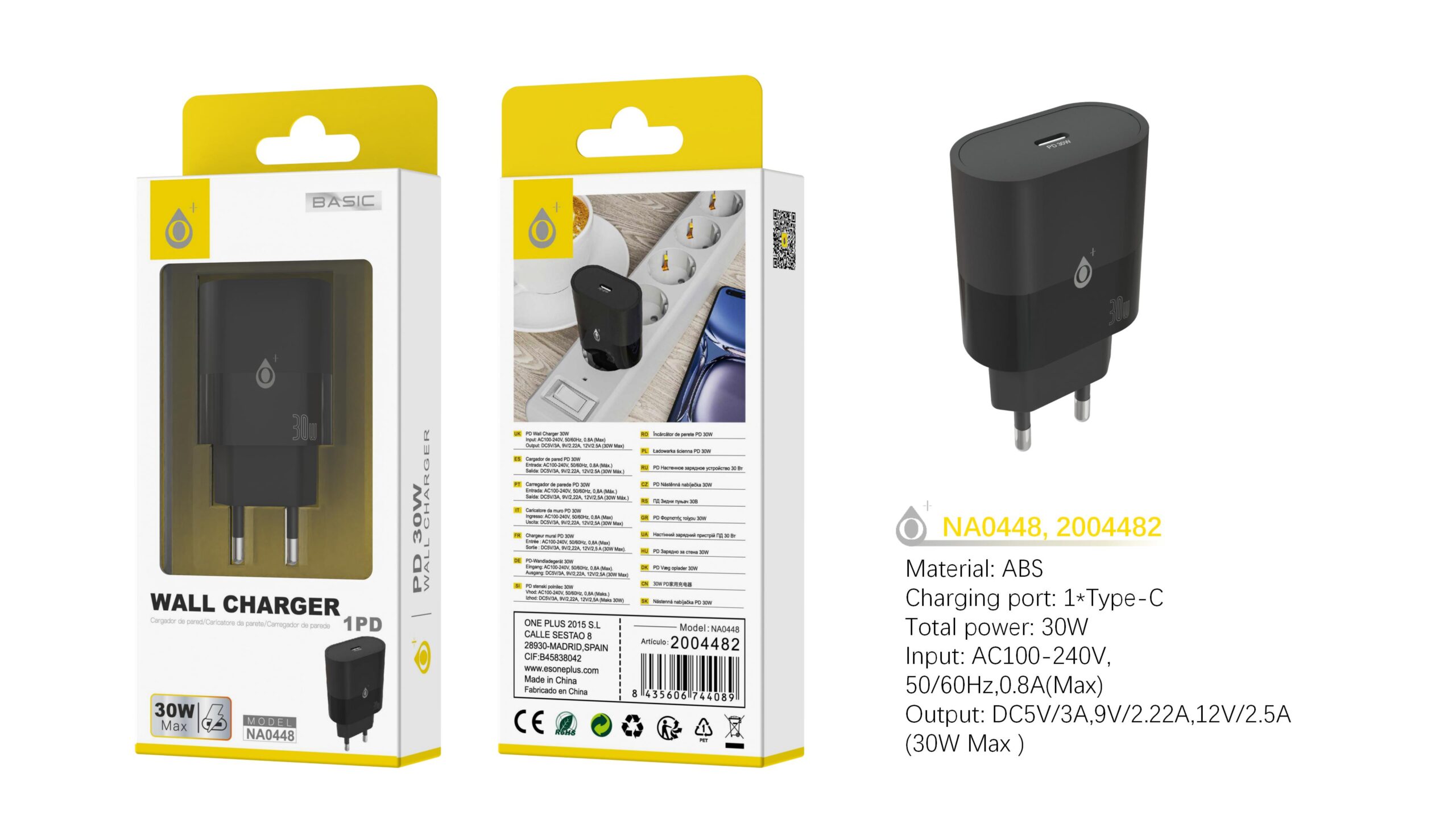 NA0448 NE Cargador de Red Rapida Jorwin 30W, 1 Type-C PD, Sin cable, Negro